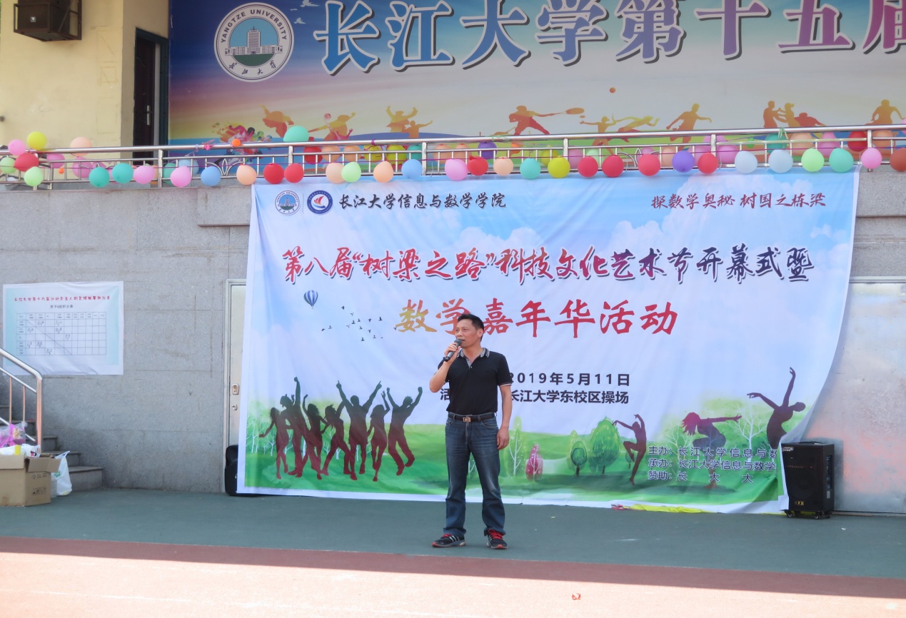 第八届“树梁之路”科技文化艺术节开幕式暨数学嘉年华活动在东校区田径场隆重举行。院党委书记高迎斌、副书记袁海山、院团委书记严星、辅导员钟赛、院系教师代表及长大大数据赞助商彭斌出席活动开幕式。