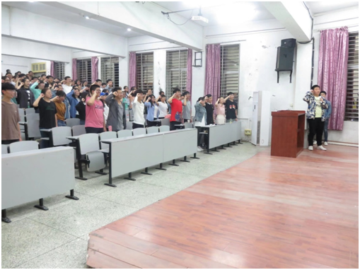 天行健,君子以自强不息。钟赛老师以“自强自立”为主题展开讲述,引导学生在习近平新时代中国特色社会主义思想引领下,要知恩于心,感恩于行,开拓进取,钻研学习,用实际行动来回报国家与社会对自己的温情关怀,从今天开始,从此刻做起,一步一个脚印,朝远大目标前行。随后,钟赛老师介绍了国家奖助学金的类别,使同学们对国家资助政策有了更为全面地了解;并从国家、父母、老师、朋友四个层面向同学们阐述了如何感恩:国家——艰苦奋斗,为祖国建设贡献自己的一份力;父母——关心亲人,常回家陪伴为自己默默付出的父母;老师——尊师重道,努力学习就是对老师最好的感恩;朋友——互帮互助,在朋友需要之时伸出援手。最后,全体同学进行宣誓:立志做一个无愧于师长,无愧于青春,无愧于未来的大学生。
