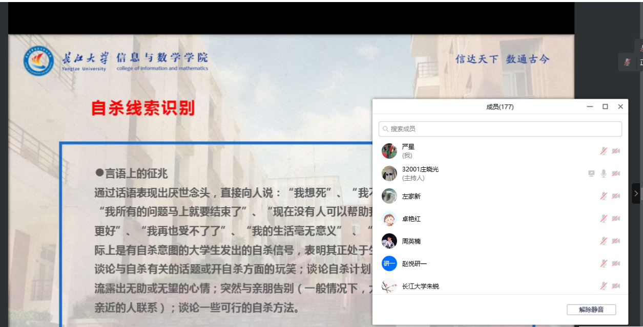 钟老师主要从心理健康重要性、心理危机的识别、学生骨干如何干预、羞羞漫画