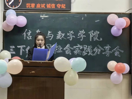 会上,志愿服务队队长黄若男作为代表发言,用生动的故事和丰富的图片,向与会师生展示了成员们在社会实践中的所见所闻、所思所想。在孝昌小悟乡林业中学,从教室到操场,从丰富多彩的数学科普游戏到感动人心的红色文化故事,成员们的实践内容丰富多彩,在传递科学文化知识的同时,志愿队成员还去了部分同学家中家访,通过关爱行动传递了温暖与爱心,展现了当代大学生的社会责任感和人文关怀。