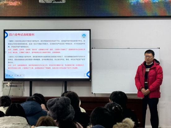 会议的第二部分聚焦诚信应考主题。谷书记强调,作为研究生,必须自觉践行学术道德,严格遵守考试规范,杜绝任何形式的违纪行为。他结合即将到来的全国大学生英语四、六级考试,指出其作为国家级考试的重要性,并说明了违规行为将面临的严肃处理。通过分析近年来高校中的典型违纪案例,以案示警,深入剖析考试违规的严重后果,呼吁全体同学以实际行动树立诚信应考的良好风尚。