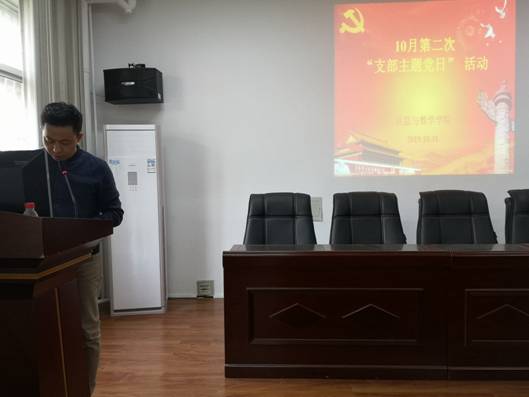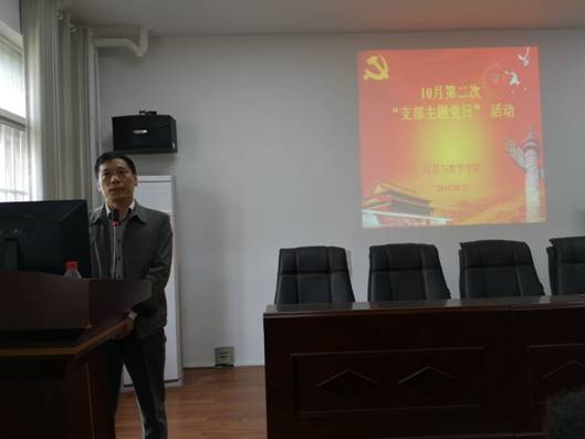 在8教406会议室举行10月第二次“不忘初心、牢记使命”主题教育支部主题党日活动。党委书记高迎斌主持,全院党员参加。