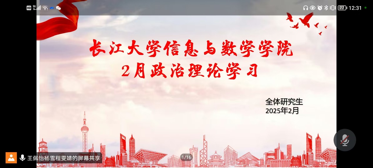 全体研究生在线上开展政治理论学习活动。活动重点围绕党的建设、国家经济发展和未来战略方向展开,旨在深刻理解和领会习近平总书记系列重要讲话精神。此次活动由研究生会组织部王佩怡主持。
