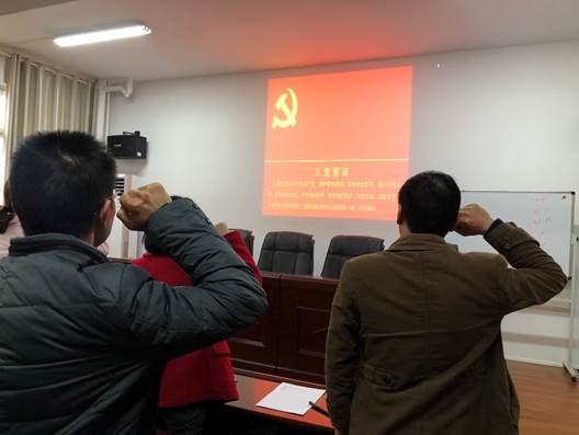 第二阶段,举行11月第二次“支部主题党日”活动。张涛带领大家诵读党章第八章(党的纪律检察机关)。全体党员起立,面向党旗,举起右手,在党委副书记袁海山领誓下,重温入党誓词。随后,以党支部为单位开展活动,各位党员交流了学习体会。最后党员按要求交纳了党费。