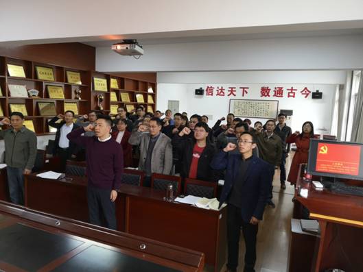 第二阶段,举行10月“支部主题党日”活动。全体党员起立,面向党旗,举起右手,在院长张涛领誓下,重温入党誓词。随后,以党支部为单位开展活动。各支部书记和所在支部党员一起诵读了党章第六章(党的干部)第三十五条至三十八条,通读了《习近平关于“不忘初心、牢记使命”论述摘编》第一部分中国共产党人的初心和使命(P3-22页)。然后开展讨论交流,每名党员对照党章、准则、条例及群众意见建议,查找自己在党员意识、担当作为、服务师生、遵守纪律、作用发挥等方面存在的差距和不足。最后党员按要求交纳了党费。