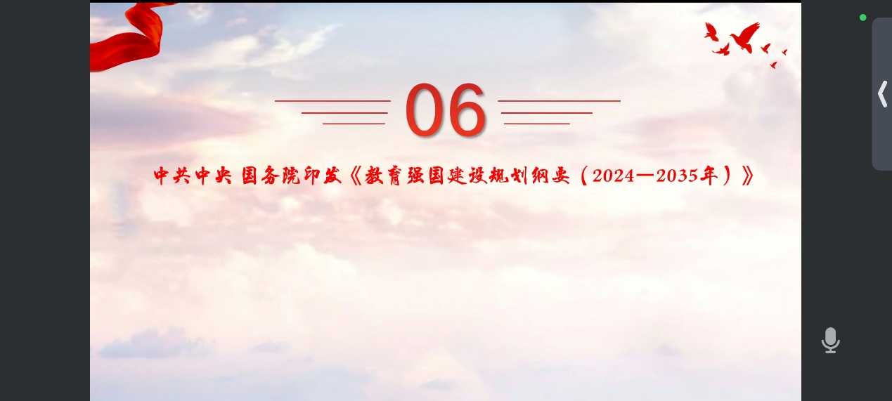 活动还深入传达了教育强国建设的目标要求、规范人脸识别技术处理人脸信息活动的相关法律法规以及全国民族团结进步表彰大会精神等重要文件和会议精神。教育强国建设目标明确了到 2027 年教育领域需取得的重要阶段性成效,包括教育普及水平的持续提升、高质量教育体系的初步形成、人才自主培养质量的全面提高等内容。规范人脸识别技术的相关法律法规则强调了保护个人信息权益、规范新兴技术应用的重要性,增强了同学们的法治意识和维权观念。全国民族团结进步表彰大会精神则让同学们深刻认识到维护民族团结对于国家稳定和发展的重要意义,体会到各民族团结奋斗、共同推进现代化建设的磅礴力量。