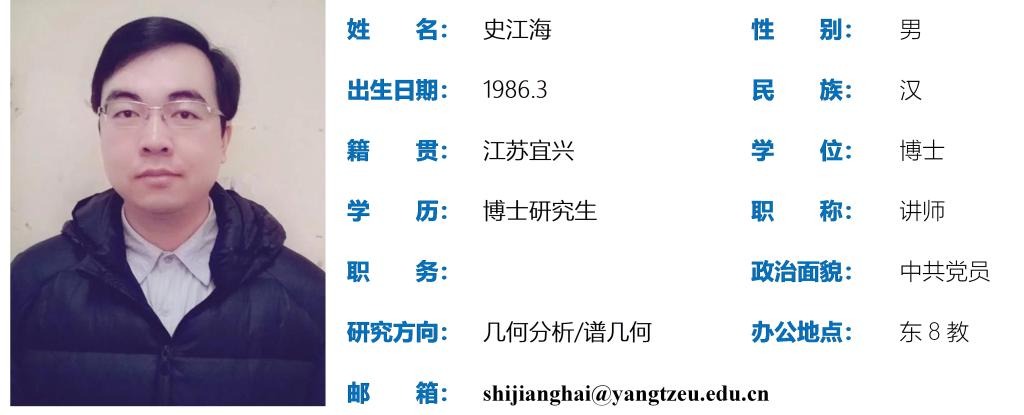 史江海,男,博士,讲师,主要研究方向为几何分析、谱几何。2018年6月毕业于武汉大学数学与统计学院;主持湖北省教育厅科学技术研究计划重点项目1项;发表学术论文8篇;获得羞羞漫画