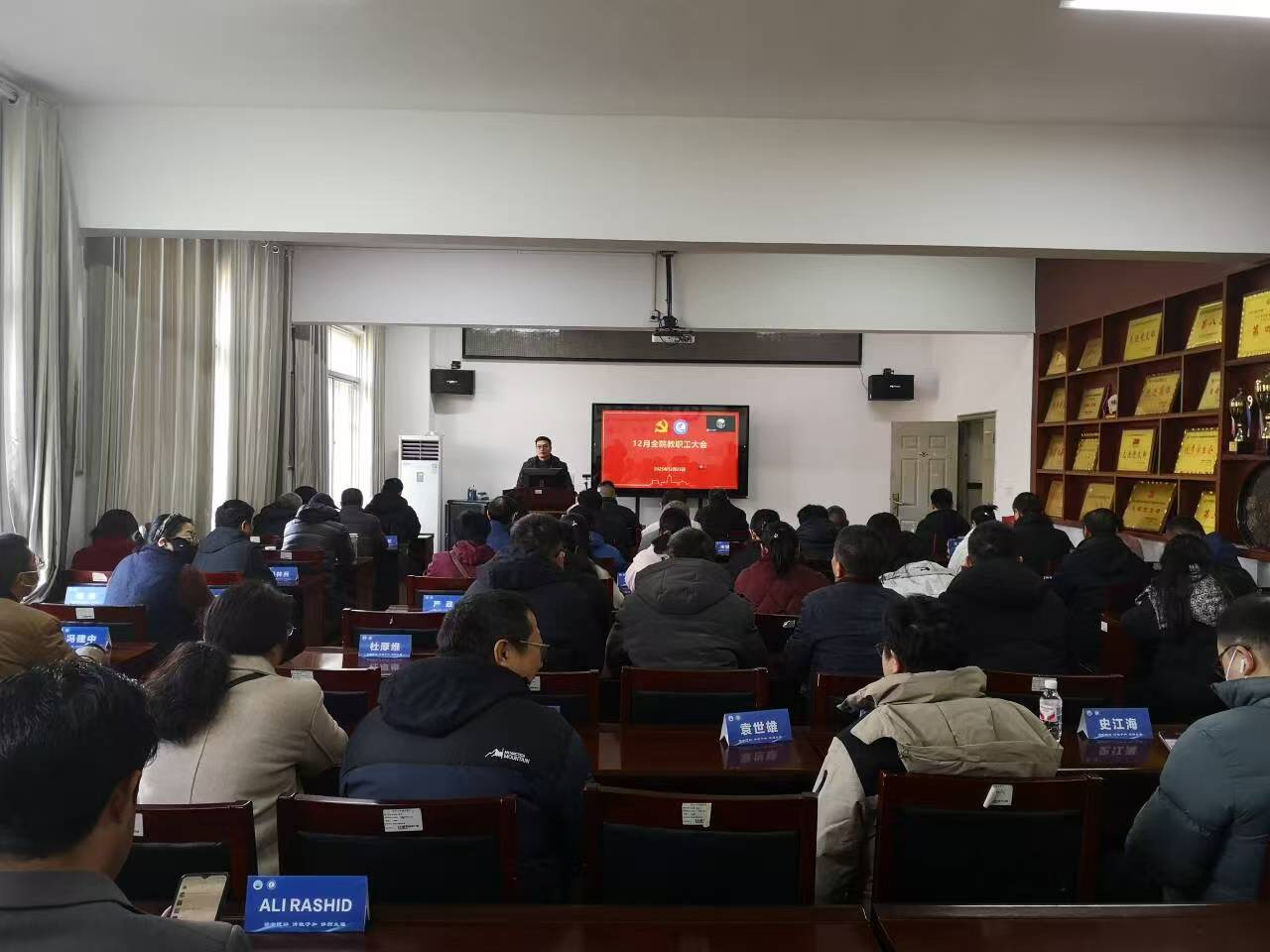 在8教406会议室召开全院教职工大会,武汉校区教职工线上同步参会。